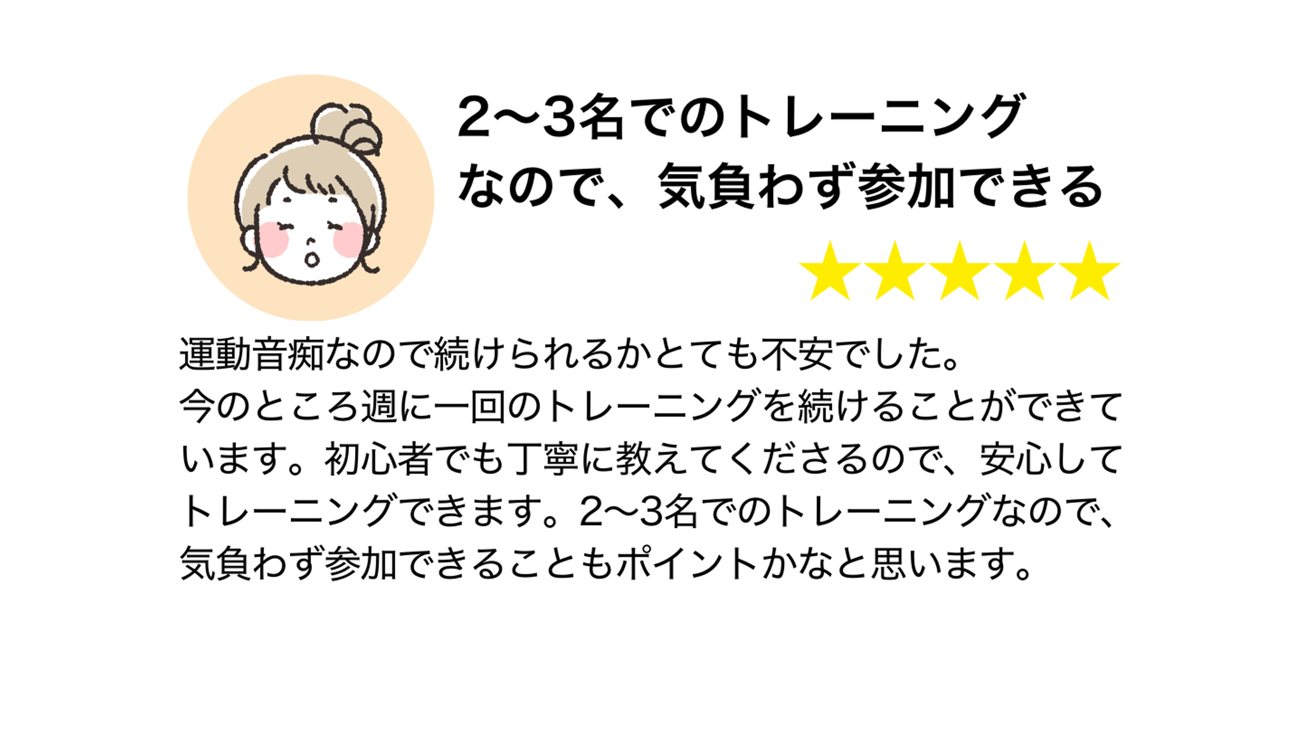 「指導がないジム」とは違い、毎回トレーナーが個別に指導します。少人数制だからこそ可能なサービスです。